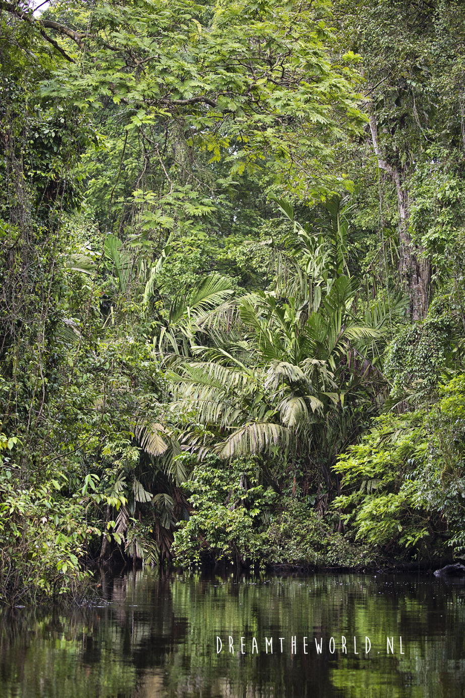 Als je naar Tortuguero gaat dan is vervoer per boot de beste manier om de pracht van het nationale park te zien. Wij boekten een vroege boottour en een middagtour. Het is raadzaam om vroeg op pad te gaan, het is dan nog lekker rustig en de dieren laten zich vaak goed zien. Als wij in de ochtend vertrekken begint het flink te regenen. Nee hé, daar zitten we natuurlijk niet op te wachten. Na geklungel met een poncho en de poncho van mijn voorbuurman die de hele tijd in mijn gezicht wappert (en bedankt), proberen we ondanks de regen toch te genieten van al het moois. Gelukkig houdt het na een tijdje op en kunnen die rotponcho’s uit. We glijden kleinere kanalen in en we wanen ons in een sprookjes omgeving. Doordat het vroeg is en het net geregend heeft is het nog wat mistig en echt overal om ons heen is het groen. Wow wat een mooie wereld! In de middag gaan we in de herhaling en zien we weer een supermooie groene wereld vol dieren. We zien heel veel vogels, luiaards, verschillende soorten apen, vleermuizen, kaaimannen en hagedissen.
