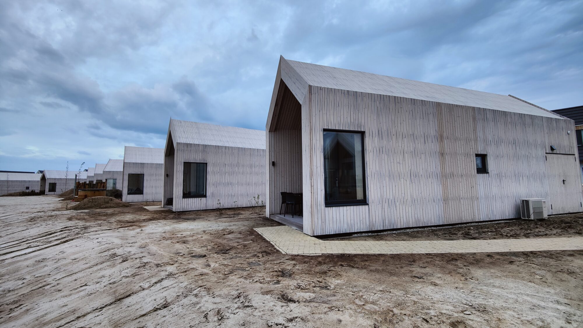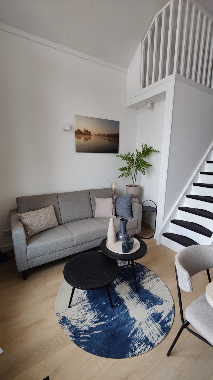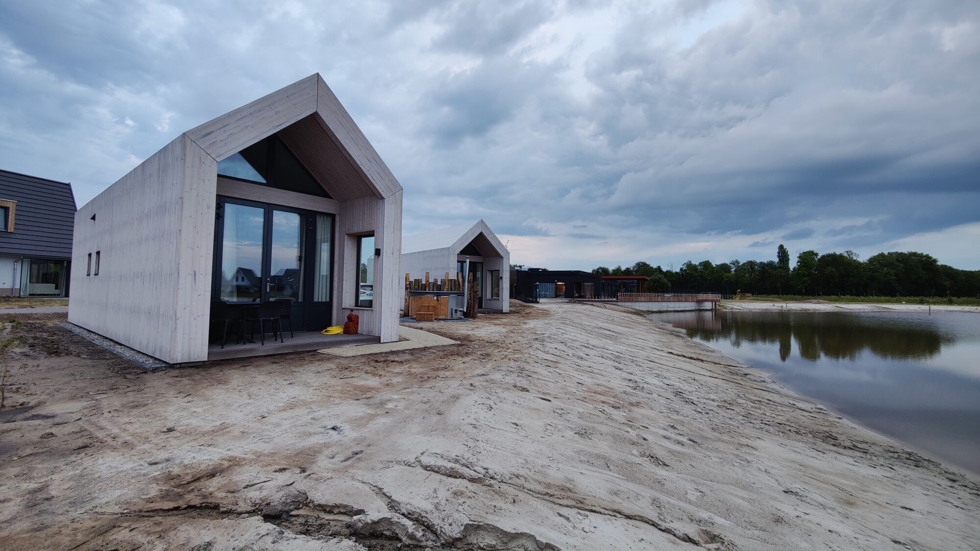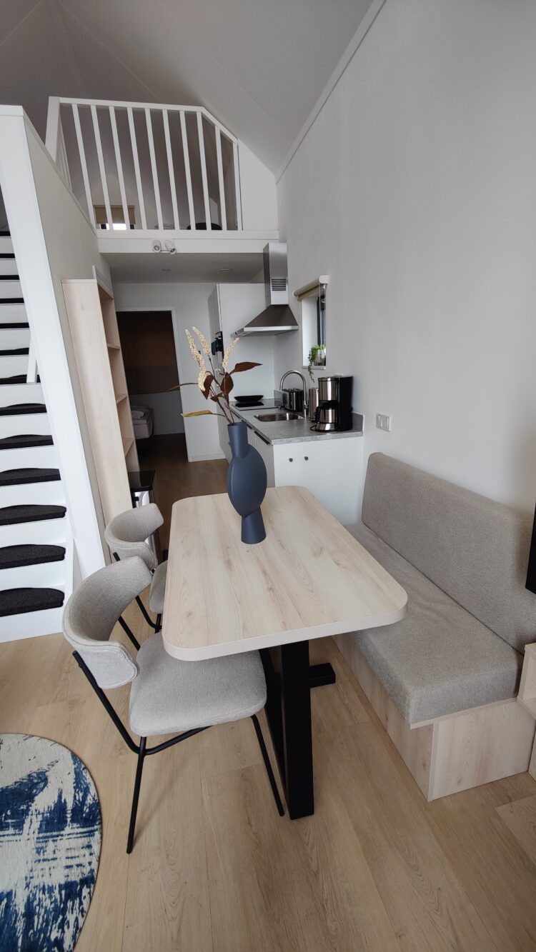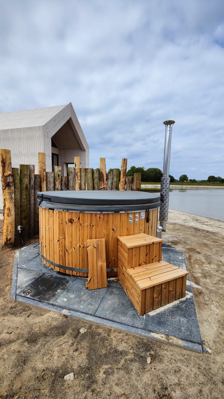 De vierpersoons Lodge aan het zwemwater doet mij denken aan een Tiny Beachhouse. Dit komt door de ligging uiteraard, maar ook door de inrichting met lichte kleuren en veel wit, zand en blauwtinten. De Lodges zijn niet groot, maar wel van alle gemakken voorzien. Er zijn twee slaapkamers, een boven in de vide met 2 eenpersoonsbedden en een beneden met een tweepersoons bed. Verder beneden een woon- en eetkamer, een open keuken, een badkamer en een apart toilet. Afhankelijk welke type je geboekt hebt, vind je buiten ook een hottub. Die moet je zelf vullen en leegmaken met water en opwarmen met hout. Je hebt een overkapt terras met tafel en stoelen, waar je in de ochtend heerlijk in het zonnetje kunt zitten, als je geluk met het weer hebt. Er zijn ook vierpersoons Lodges met een buitenkeuken.