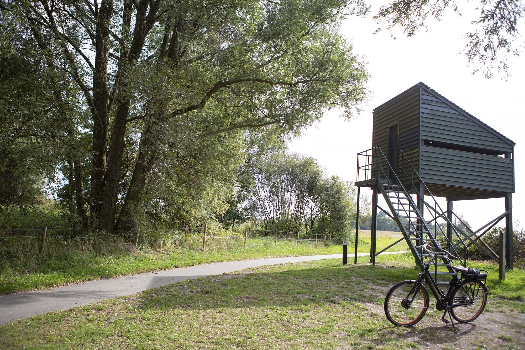 Ik fiets even een stukje door een bosachtige gebied. Tussen bomen omringd door zwavelzwammen. De herfst is wel in aantocht, maar nog niet echt begonnen als ik deze route eind september fiets. Vanuit het bos zie ik de grote zwarte doos op poten al opdoemen. Het is de vogelkijkhut aan de rand van het water. Normaalgesproken zie je hier veel watervogels, volgens de website van het Nationaal Park, maar ik heb pech want ik zie helemaal niks vanuit de hut. Maar dat zegt weinig, vogels zien en fotograferen is een kwestie van geluk en geduld. Dat laatste heb ik niet tijdens mijn fietstocht, want er is nog veel meer te zien op mijn route.