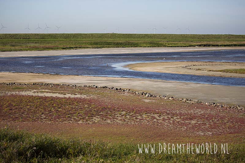 We zien ‘m al een tijdje staan, uitkijktoren de Zuidkaap. Dit is de enige plek waar je het natuurgebied in kunt. Het is tevens begrazingsgebied, dus uitkijken voor runderen. Wij komen er geen tegen. Wel zien we heel veel zeekraal om ons heen. Rode zeekraal. Hoewel een deel alweer meer bruin aan het worden is. Vanaf de uitkijktoren heb je een prachtig uitzicht op de zeekraal en op het krekengebied. De rode zeekraal steekt prachtig af tegen het blauwe water. Wat een kleuren. September is echt de perfecte maand om hier van de kleuren te genieten.