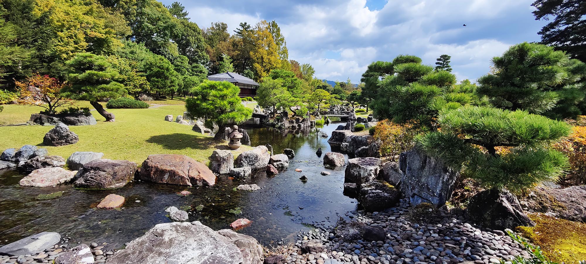 Als je Ninomaru Palace uitgebreid hebt gekeken kom je in de gelijknamige tuin uit. Deze bestaat uit een grote waterpartij met bizar grote rotsendoor omringd door verschillende soorten pijnbomen én sakurabomen (Japanse kersenbomen). Tijdens het voorjaar is het een extra mooi zicht als de kersenbomen in bloei staan. Het kan dan ook heel druk zijn. In het water van de grote vijver zwemmen heel veel koi karpers, in Nederland een bijzondere en dure vis, in Japan zie je ze echt overal.
