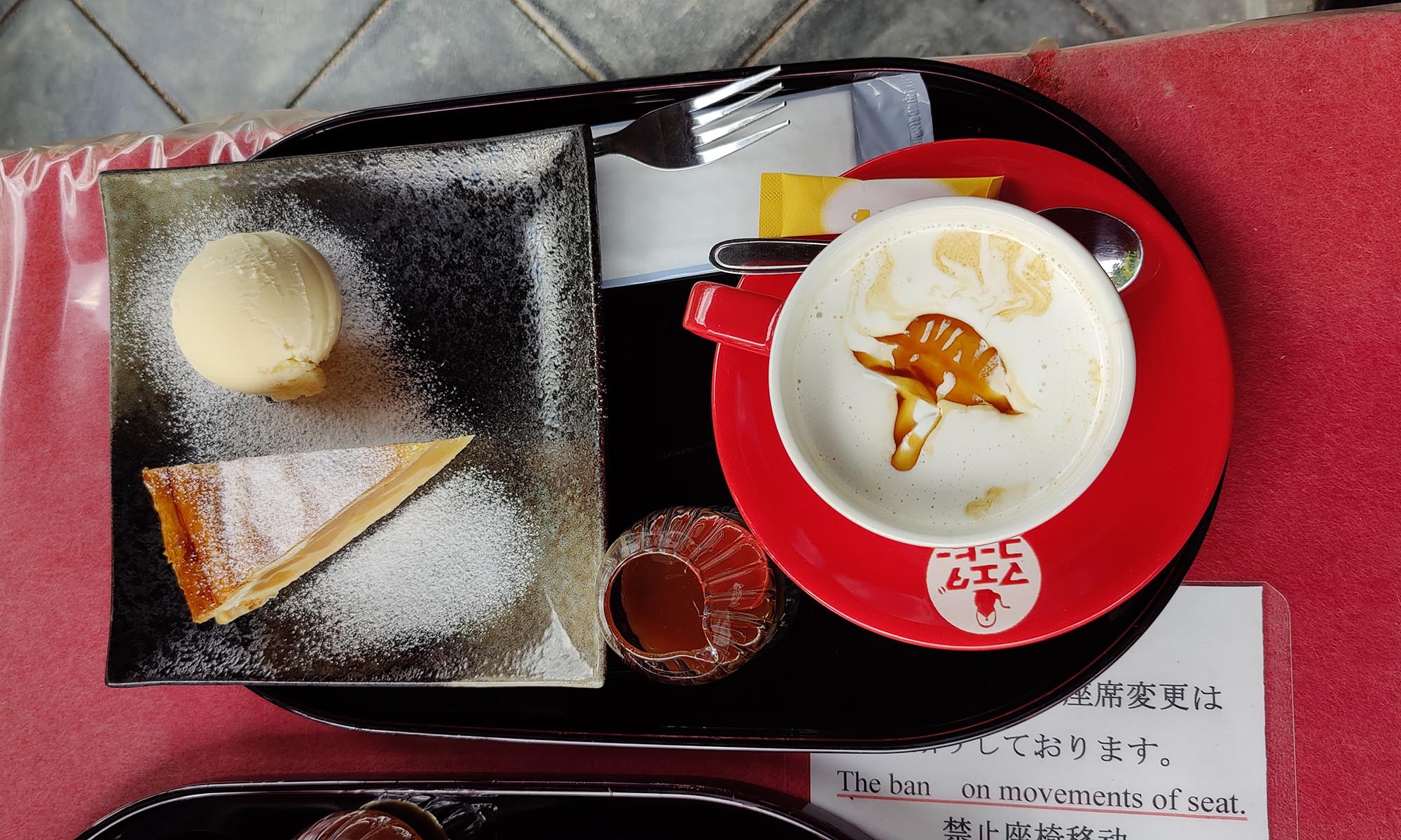 Op het terrein zijn twee theehuizen, waarvan er een ook open is voor ‘gewone’ bezoekers: theehuis Waraku-an. Dit theehuis vind je in de Seiryu-en tuin in het Japanse gedeelte. Je kunt binnen plaatsnemen, maar er staan ook banken buiten. Als het lekker weer is, dan is het heerlijk om op deze banken plaats te nemen. Wij hebben geluk en kunnen op een bank plaatsnemen. Natuurlijk kan je hier een matcha (groene thee) bestellen, maar ook koffie met appelgebak. Deze was zó verfijnd en lekker. Een echte aanrader om hier dus even iets te drinnken en te genieten van de mooie tuin. Vogels vliegen hier af en aan bij al die waterpartijen. Misschien zie je ook wel een Brown-eared Bulbul net als ik.