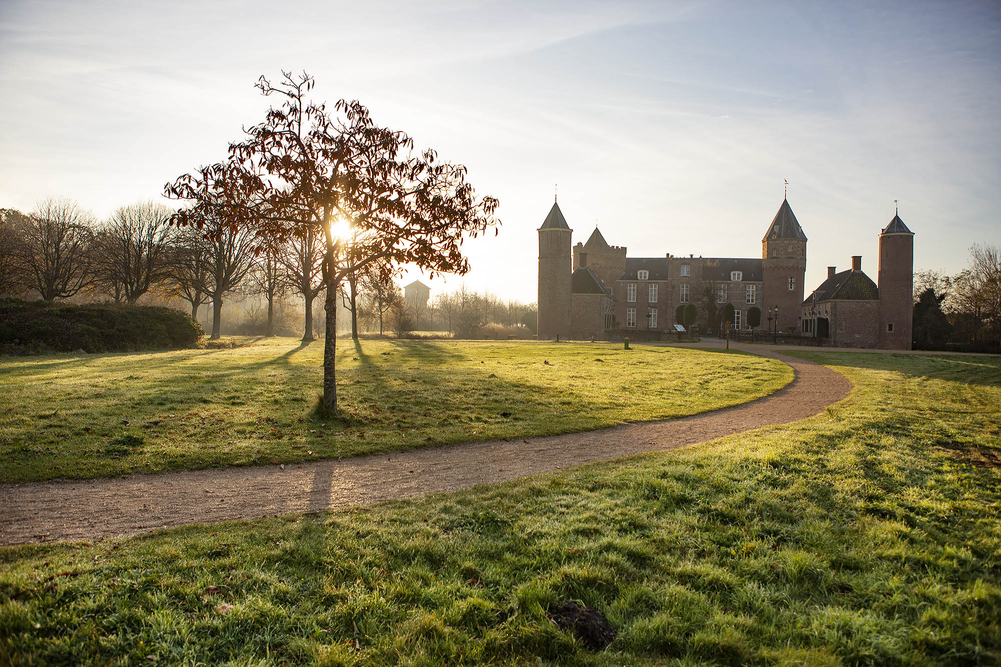Ik kom op een splitsing. Rechts ga je naar het strand en links richting de buitenplaatsen van De Manteling. Ik kies voor het laatste. Mijn ogen en oren houd ik open, want hier komen heel vaak herten voor en zeker nu ik zo vroeg ben, is de kans groot dat ik ze zie. Ik wandel de Berkenbosch buitenplaats op en kom in een statige laan omringd door kronkelbomen. Ook wel het kronkelbos genoemd. En ja hoor. Daar zie ik een groep damherten op hun gemakje grazen. Ze houden me in de gaten, maar vinden het niet erg dat ik op een afstandje sta te kijken. Als er een hond van de andere kant komt zijn ze wel direct weg. Maar het geeft niet want het zullen niet mijn laatste herten zijn vandaag.