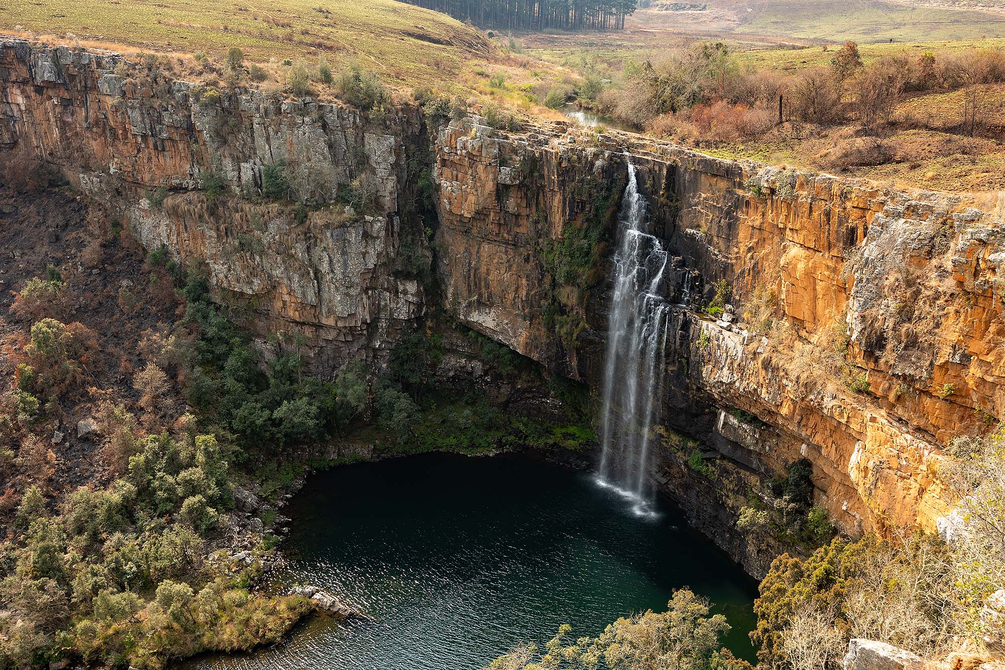 Wij zijn in augustus in Zuid-Afrika en dat betekent dat het daar winter is. In de winter regent het nauwelijks, met als gevolg dat de watervallen niet zo groot zijn in omvang. Toch vind ik ze de moeite waard. De eerste waterval die je langs de route vindt is de Berlin Fall, hiervoor moet je even iets van de hoofdroute af. Hoewel deze nu niet heel groot is, is het toch de moeite van het stoppen waard vind ik. Dat komt ook door de kleuren van de rotsen en het blauwe water onderaan.
