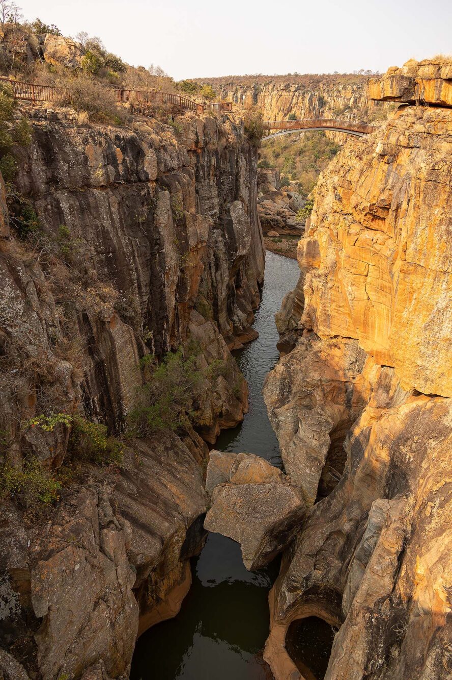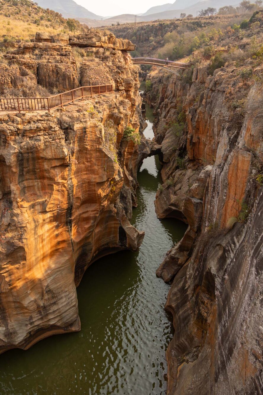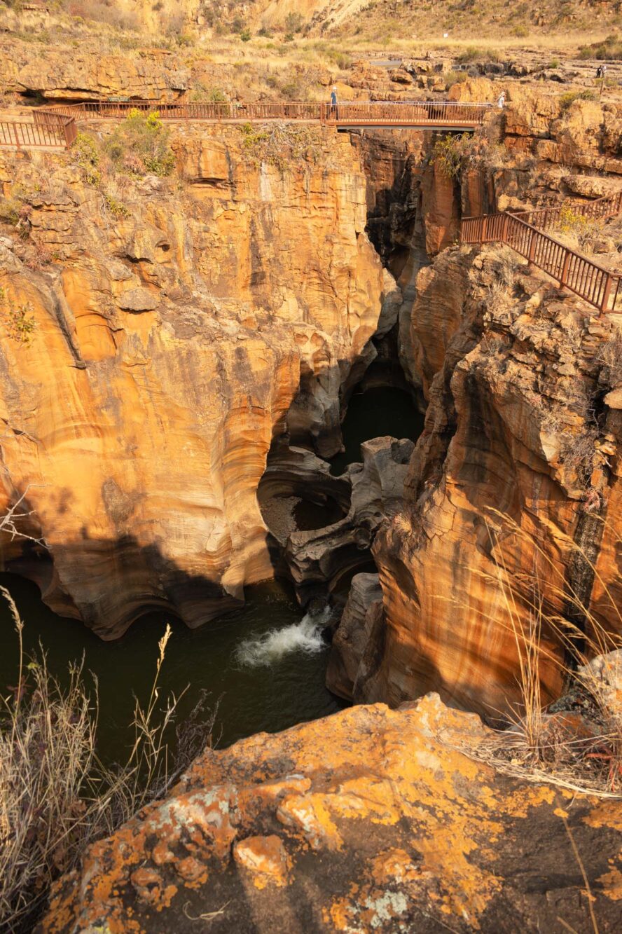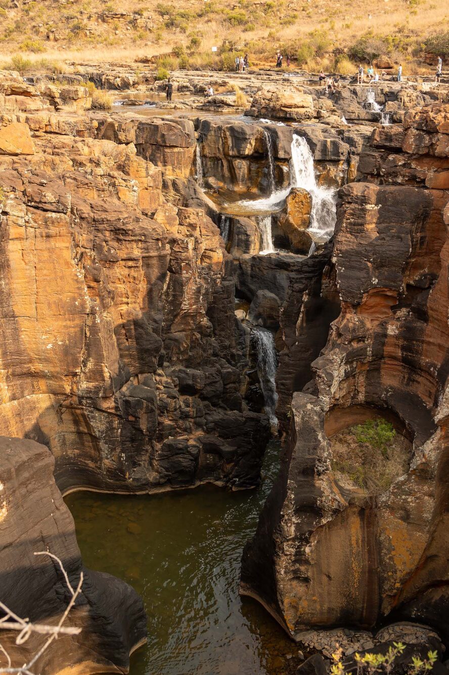 Een van de grootste trekpleisters langs de Panoramaroute is Bourke’s Luck Potholes. Een vreemde naam voor dit natuurverschijnsel. We staan bij een kloof en zien rotsen met uitgesleten ronde vormen. De stroming en draaiing van de twee rivieren die hier samenkomen (de Treur en de Blyde rivier) hebben er jarenlang voor gezorgd dat de rotsen langzaam uitsleten. Op veel plekken zijn nu alleen nog maar ronde vormen over. Deze plek is genoemd naar Tom Bourke, die riep dat hier goud gevonden zou worden. Hij had zelf geen geluk en er werd nooit goud gevonden, maar later werd er ten zuiden van deze plek wel goud gevonden. Neem de waarschuwingsbordjes om op het pad te blijven serieus, het kan er glad zijn en er zijn al toeristen hier verongelukt.