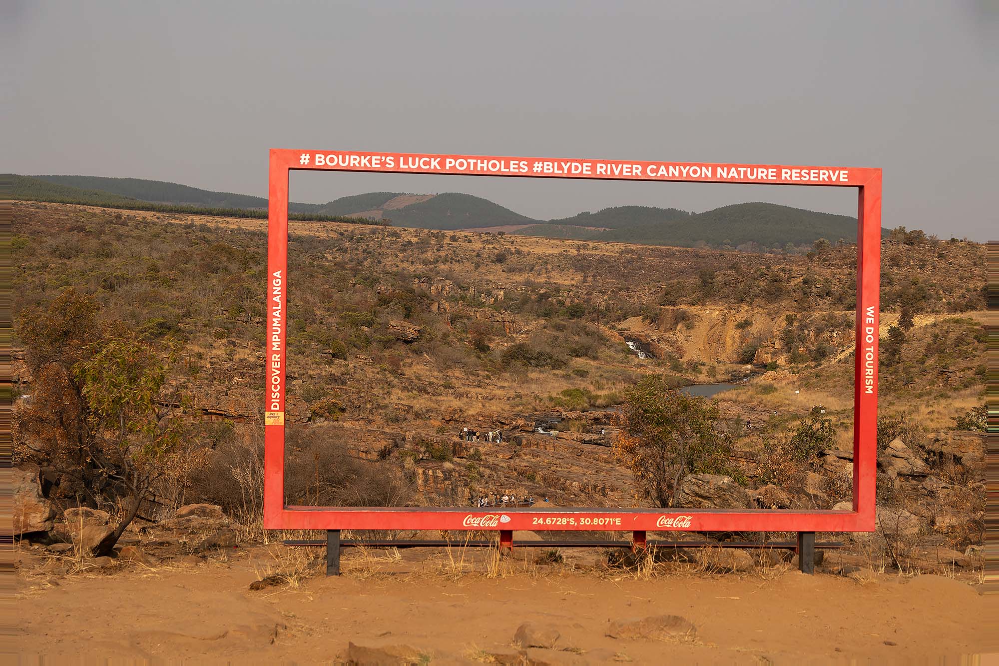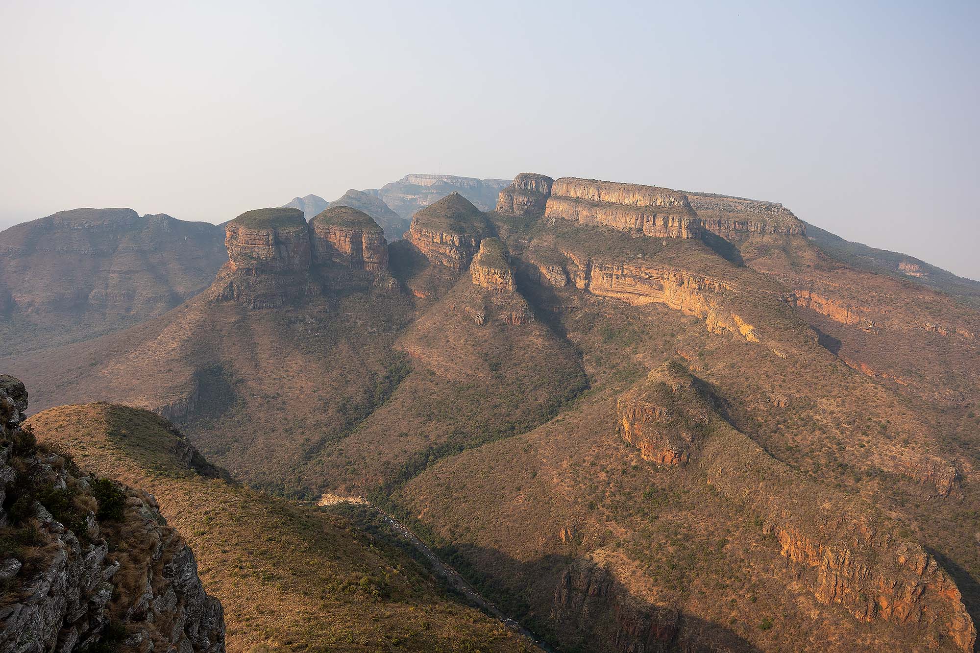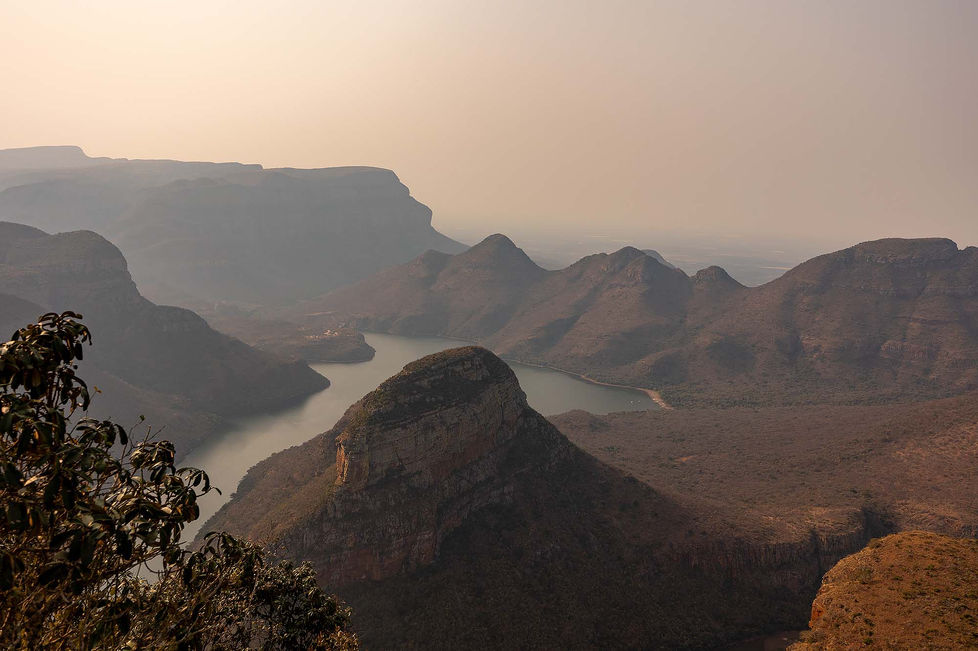Als je bij de three rondavels langs het uitkijkpunt naar links loopt, zie je de rivier en stuwmeer Blyde river dam liggen. Een prachtig uitzicht, hoewel het zicht zelden heel helder is. De Blyde River Canyon is de derde grootste kloof ter wereld, na de Grand Canyon in USA en de Fish River Canyon in Namibië. Het is een prachtig gebied, dus deze moet zeker op je lijstje om te bezoeken als je de Panoramaroute rijdt.