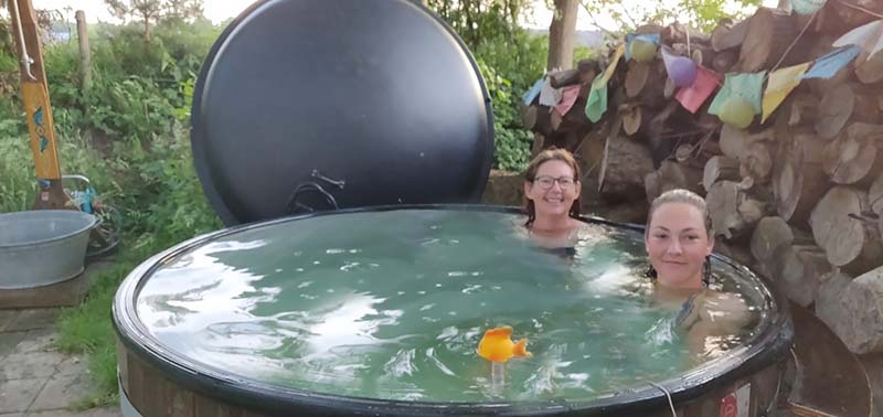 Voordat we naar ’t Buitenland vertrekken krijg ik nog een heel document met allemaal leuke tips en bezienswaardigheden in de buurt. Maar als we eenmaal bij ’t Buitenland zijn en we de hangmatten zien besluiten we dat we eigenlijk helemaal geen zin hebben om veel te doen. Gewoon lekker een middagje relaxen in de hangmat met boek en drankje binnen handbereik en we zijn gelukkig. Af en toe even uit de hangmat om het vuurtje van de hottub op te stoken. Waar we na de barbecue heerlijk van genieten.