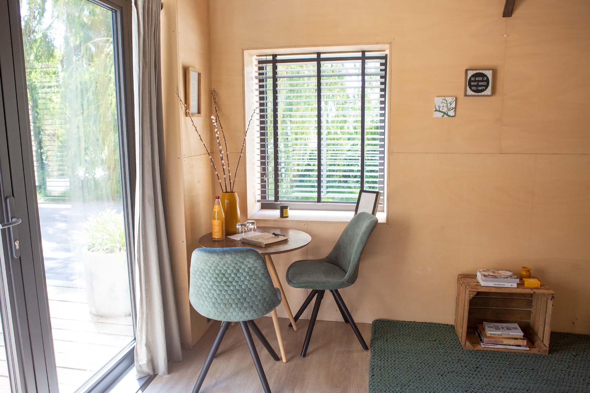 Wat mij meteen opviel toen ik binnenkwam waren de sfeervolle hoekjes in het Tiny House. Zo vind je overal leuke boeken, kaartjes en quotes. Het maakt me echt blij. Verder is de Appelaere een warm welkom, de beste appelsap komt uit Zeeland. ’s Avonds als het donker wordt steek ik de kachel aan en drink ik mijn wijntje voor het knapperend vuurtje. Voor de temperatuur is het niet nodig, maar het is zo sfeervol!