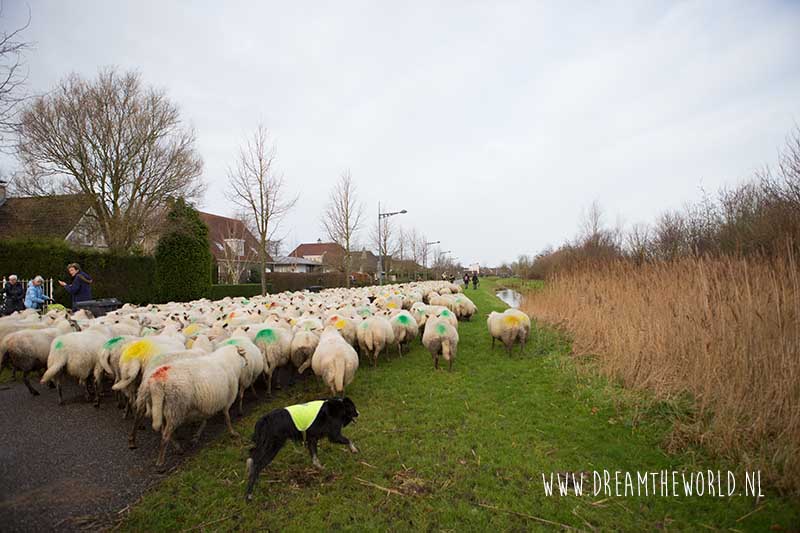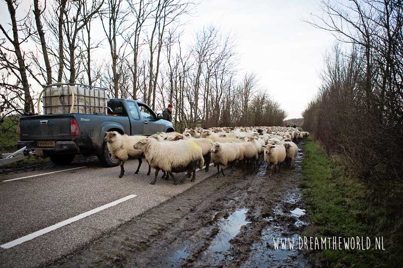 Het is een hele onderneming, 520 schapen van de weides in St Laurens naar de stal in Middelburg brengen. Herders Jan en Sophie hebben er hun handen aan vol op de tweede dag in het nieuwe jaar. Gelukkig hebben ze hulp van hun honden, die de schapen vakkundig in het gareel drijven. Iedereen die het leuk vindt mag met de kudde meelopen. Dat laat ik me natuurlijk geen twee keer zeggen. Wekker gezet, wandelschoenen aan en hup de lanen in. Een goed begin van het nieuwe jaar.
