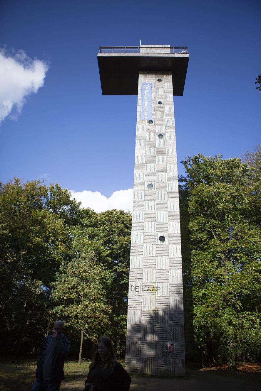 Midden in de bossen stuit ik op de uitkijktoren De Kaap. Deze 26 meter hoge toren rijst hoog de lucht in. Met mijn hoogtevrees twijfel ik even of ik de toren beklim, maar mijn nieuwsgierigheid naar het uitzicht wint het. Ik begin aan de lange klim en kijk zo min mogelijk tijdens het klimmen naar beneden. Boven waait de wind om mijn oren, ik overwin mijn angst en kijk ver uit over de bomen heen. Zo voel ik me wel klein!