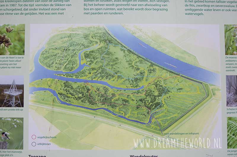 Door het gebied lopen 2 wandelroutes, een torenroute en een kijkschermroute. Beiden ongeveer 3 kilometer. Zelf combineerde ik beide routes en liep ongeveer 7 kilometer in totaal. Er is niet echt een parkeerplaats. Ik heb moeite om het beginpunt te vinden en rij een paar keer met de auto de B-weg heen en weer. De navigatie geeft toch echt aan dat ik er ben. Ik kijk naar de dijk en zie daar een groot bord met informatie. Ja het lijkt er op. Ik parkeer mijn auto dan maar in het gras en hoop dat ik straks niet vastloop in de modder.