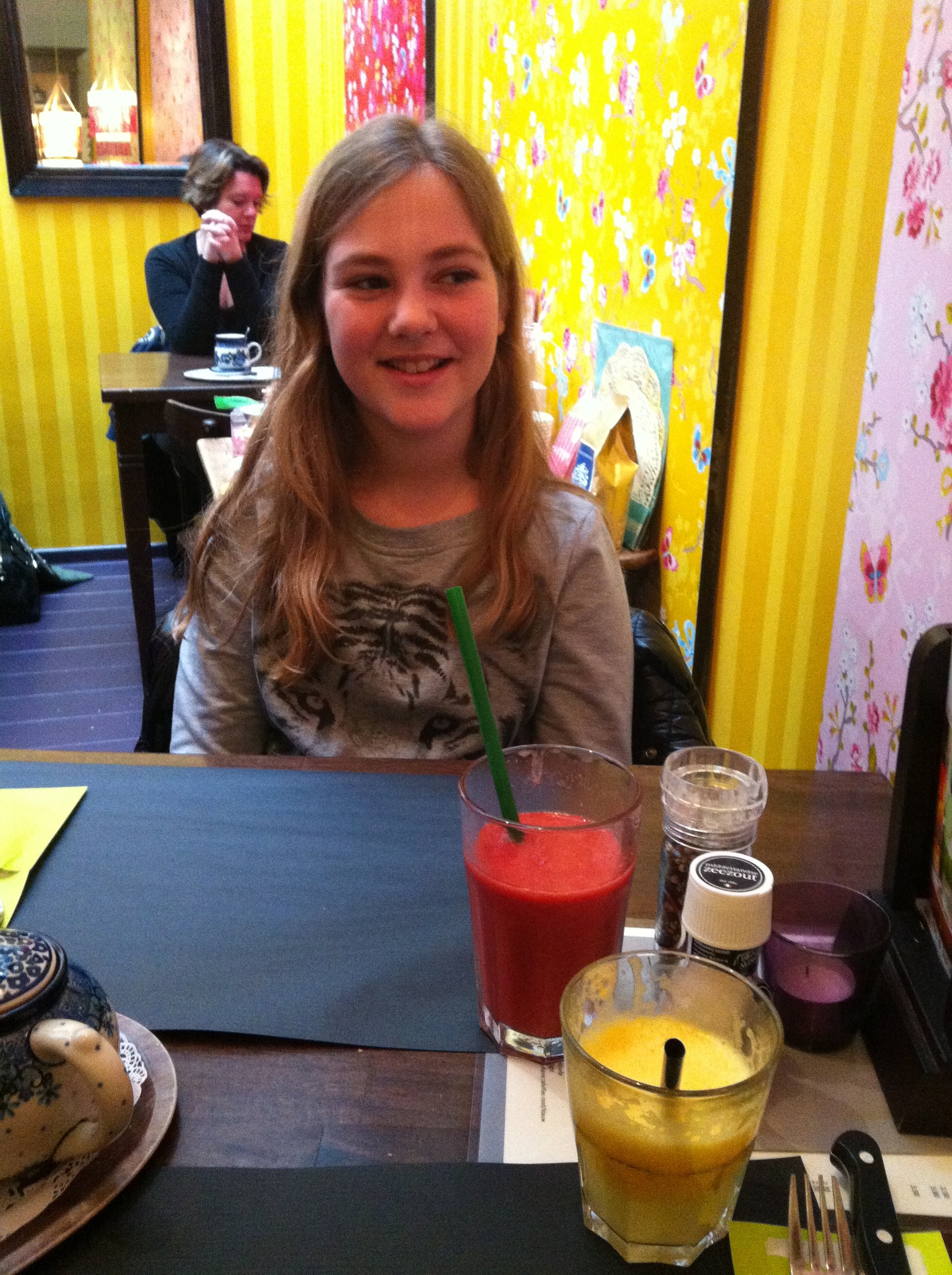 Als je moe bent van het shoppen strijk dan neer op een van de stoelen in het Wooncafé. Je hebt zowel boven als beneden zitplaatsen. En in de zomer ook een terras. Het is leuk om bij het raam te zitten maar zelf kies ik er vaak voor om juist wat meer achteraan te zitten, want daar is het heel gezellig ingericht. Vrolijk gekleurd behang, leuke lampen en accessoires. De kleuren rood, geel en roze zijn veel gebruikt. Het servies is van Bunzlau, is blauwwit en is ook te koop.